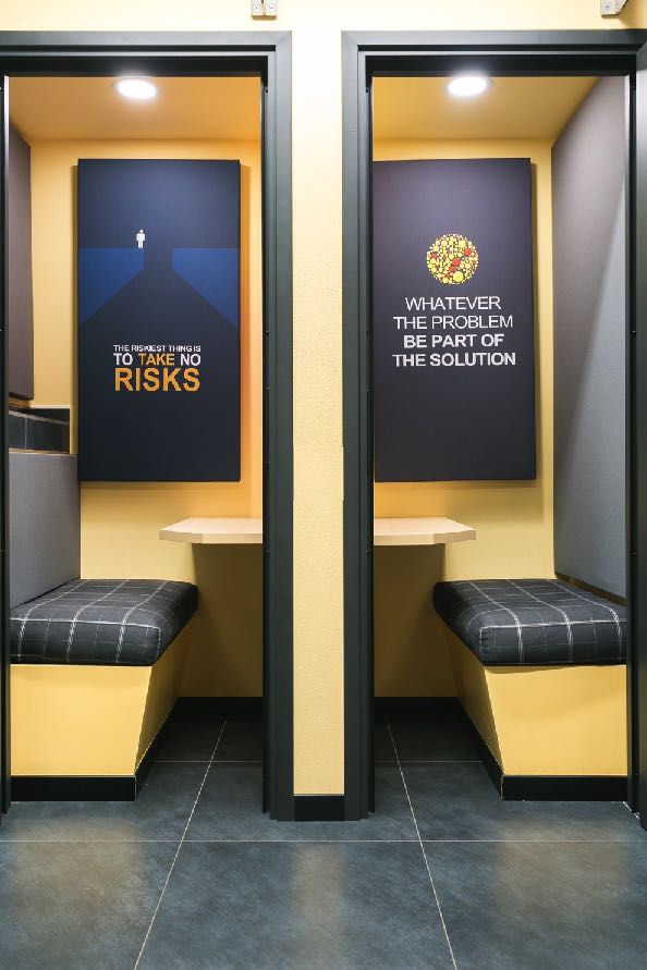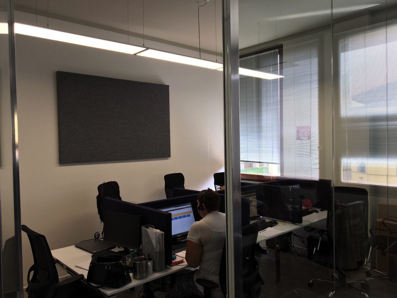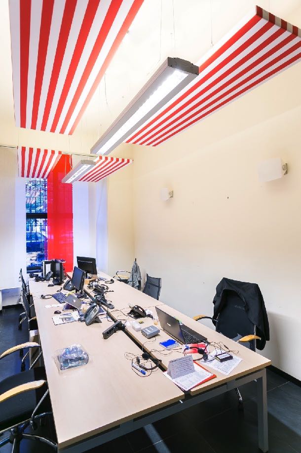 Il caso limite degli uffici è il call center, dove più persone parlano all’unisono ed è fondamentale un basso tempo di riverbero e quindi una sala con minime riflessioni sulle pareti e interazioni rumorose tra il personale: in questi casi il miglior trattamento è la corretta distribuzione omogenea del materiale tra scrivanie, pareti e soffitto, senza dover coprire tutte le superfici ma semplicemente inserendo elementi in zone specifiche che possiamo calcolare per voi.