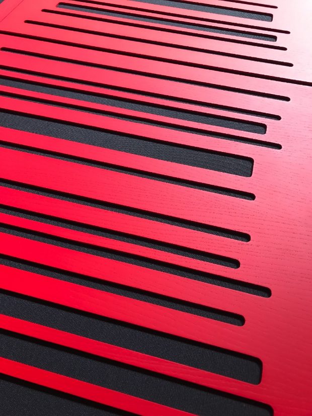 Per l’occasione esporremo anche i nuovi moduli assorbitori/diffusori con sequenza MLS nei colori rosso (nella foto), nero e legno naturale per un suono ricco, controllato e dettagliato.