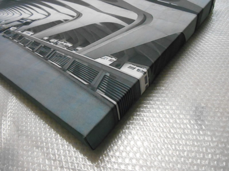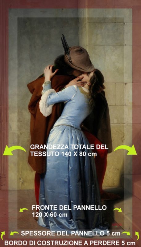 In fase di scelta dell’immagine, quindi, se vorremo stampare un dipinto astratto oppure textures non avremo grossi problemi, ma se per esempio volessimo vedere frontalmente il primo piano di un volto, sapremo che nella scelta dovremo osservare “ad occhio” che il volto abbia per ogni lato uno spazio sufficiente per essere piegato sulla profondità del pannello (5 cm) e sul retro del pannello (altri 5 cm).