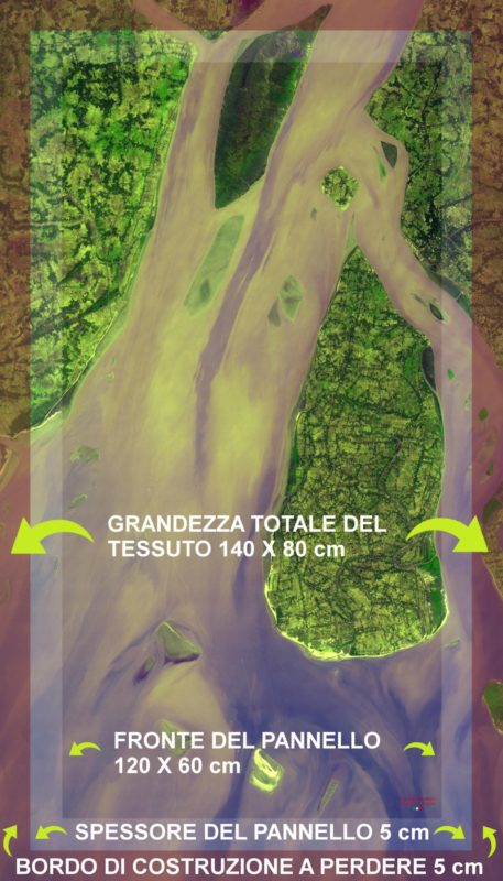 Se prendiamo come riferimento i pannelli della serie AkuPan (spessore 5 cm) a noi occorre aggiungere ai margini del pannello stesso 10 cm per lato che serviranno per creare la profondità stessa del pannello e il tessuto a perdere che utilizzeremo per la sua costruzione. Per esempio su un pannello da 120 x 60 x 5 cm dovremo partire da un tessuto 140 x 80 cm del quale perderemo alla vista un primo perimetro di 5 cm. I successivi 5 cm attorno alla dimensione di 120 x 60 cm creeranno il nostro spessore.
