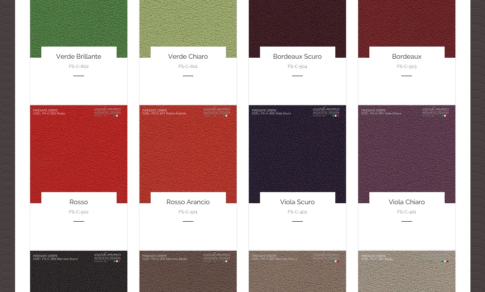 Per Oudimmo Acoustic Design l’estetica è importante così come l’acustica e per questo è presente una vasta gamma di finiture in poliestere 100%, con tessuto ignifugo FireSafe in classe 1 italiana oppure ancora con stampa su tessuto ignifugo serie ART per una personalizzazione completa di quadri fonoassorbenti con fotografie, disegni, dipinti o loghi aziendali.