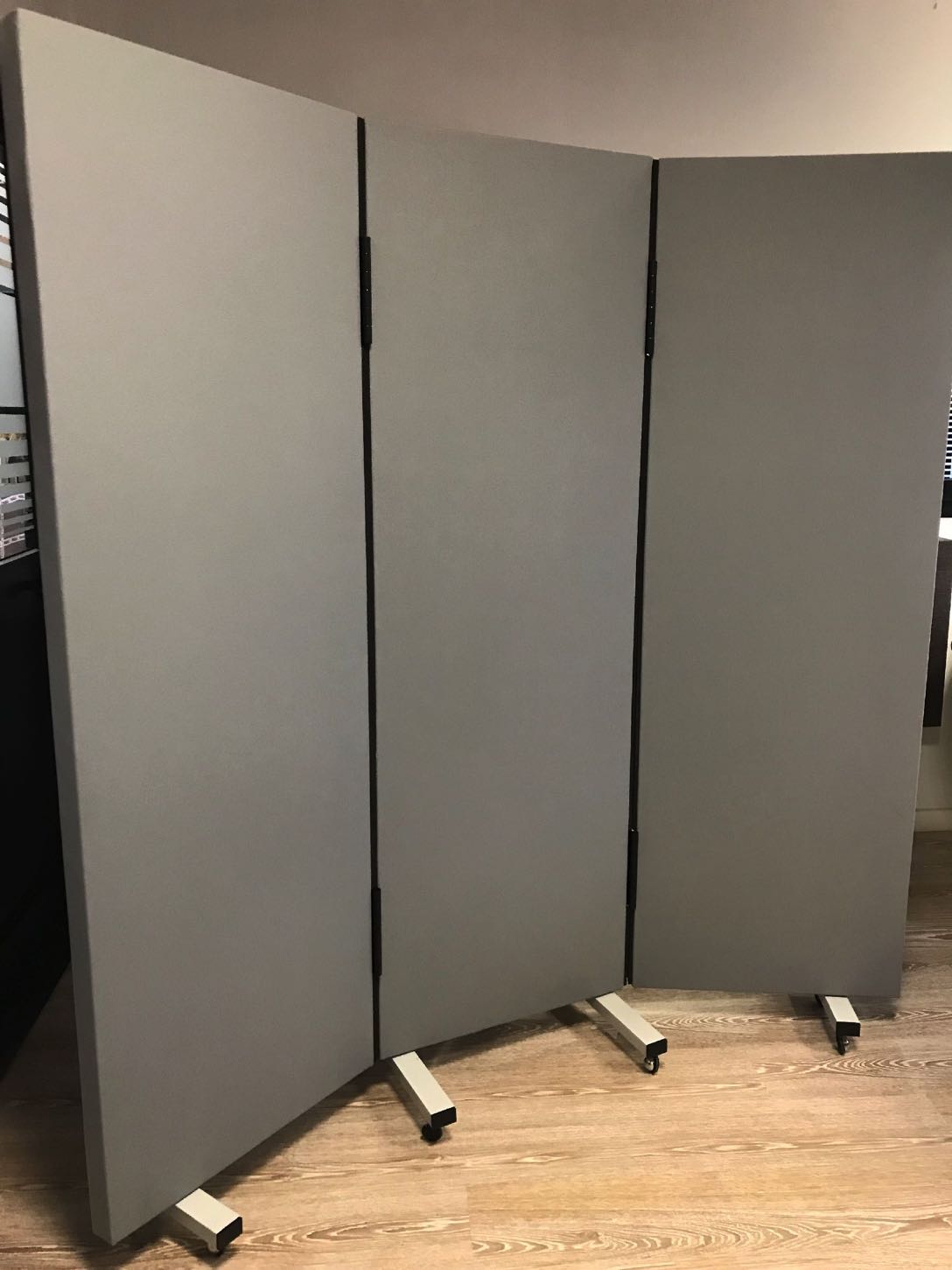 AkuPan® SCREEN FireSafe è la serie di divisori acustici e schermi separatori bifacciali ad alte prestazioni a pavimento con fonoassorbente atossico.