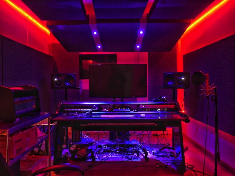 Bass trap a soffitto (studio cloud) formato da tre trappole Kombat broadband o membrana e inserti in legno massello di faggio con faretti LED per coprire le riflessioni a soffitto e per assorbire le basse frequenze con un intervento estremo.