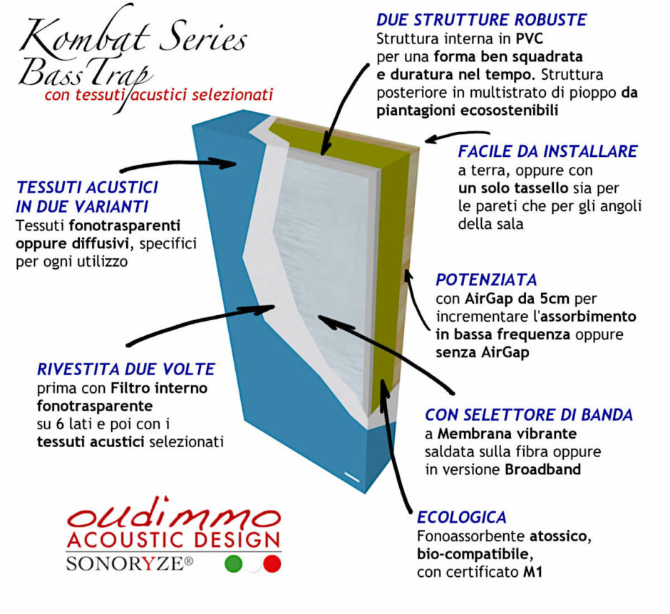 Le Kombat 10 utilizzano materiale fonoassorbente atossico ed ecocompatibile e per garantire una durabilità pressochè infinita vengono rifinite due volte, una con un filtro fonotrasparente ed una con i tessuti selezionati per la qualità e il comportamento acustico. Le strutture interne sono solide e provengono da cicli produttivi a basso impatto ambientale offrendo così una robustezza e finitura di livello professionale e la certezza del rispetto dell’ambiente.