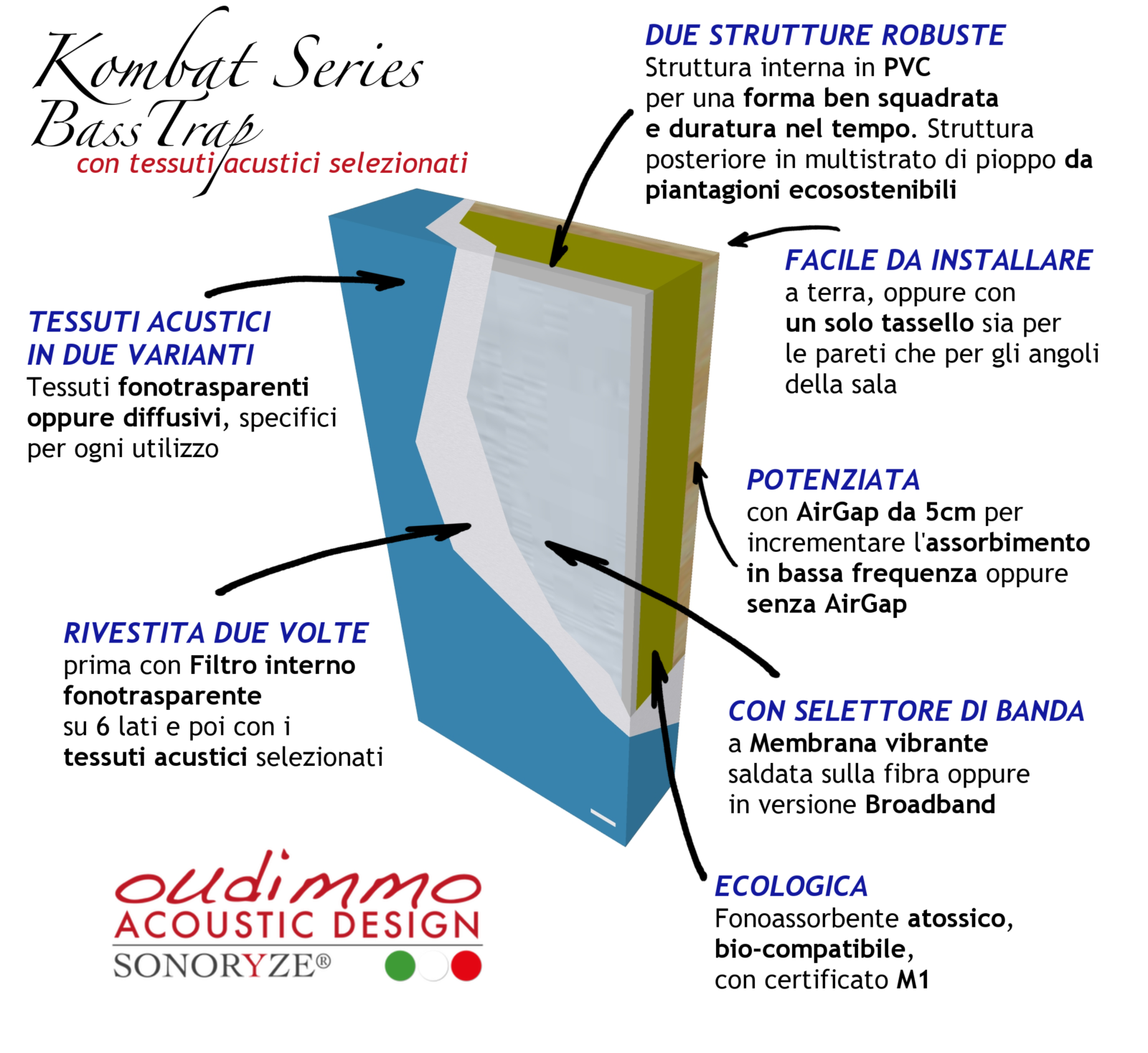 Le Kombat 20 utilizzano materiale fonoassorbente atossico ed ecocompatibile e per garantire una durabilità pressochè infinita vengono rifinite due volte, una con un filtro fonotrasparente ed una con i tessuti selezionati per la qualità e il comportamento acustico. Le strutture interne sono solide e provengono da cicli produttivi a basso impatto ambientale offrendo così una robustezza e finitura di livello professionale e la certezza del rispetto dell’ambiente.