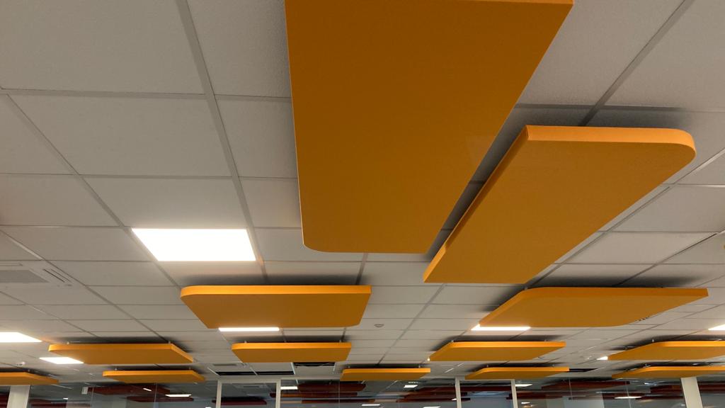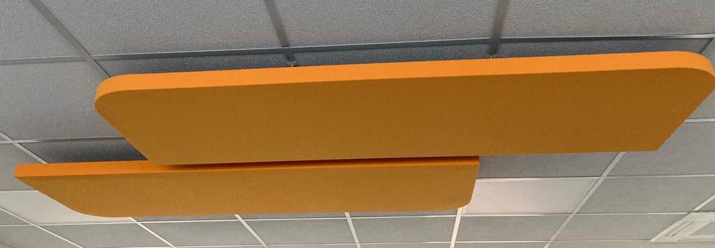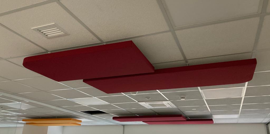 Pannelli fonoassorbenti a parete e soffitto con angoli stondati, rivestiti in tessuto ignifugo e realizzati con materiale atossico ed ecocompatibile certificato M1.