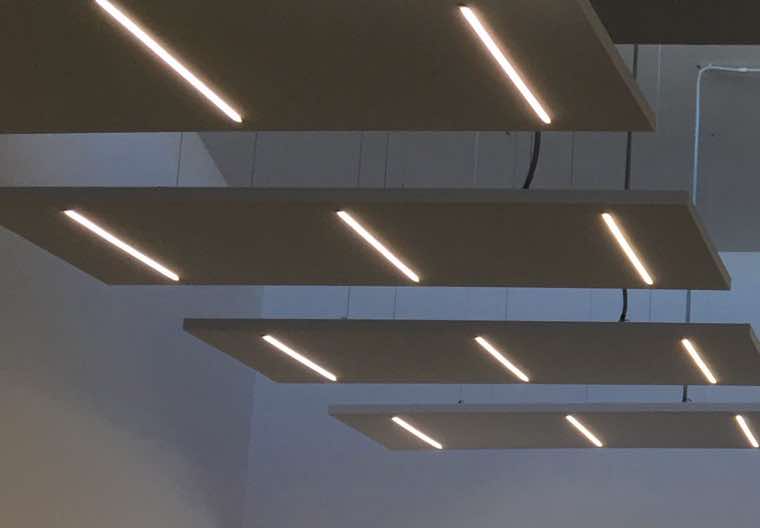 Per tutti i nostri pannelli fonoassorbenti sia per parete che per soffitto è disponibile l’integrazione di luci LED in linea o a faretto per essere utilizzati come lampade fonoassorbenti. Queste luci possono essere sia di tipologia professionale per uffici, studi tecnici, ristorazione, sia per ambienti domestici. Possiamo inoltre predisporre i pannelli per il passaggio di punti luce o lampadari sospesi.