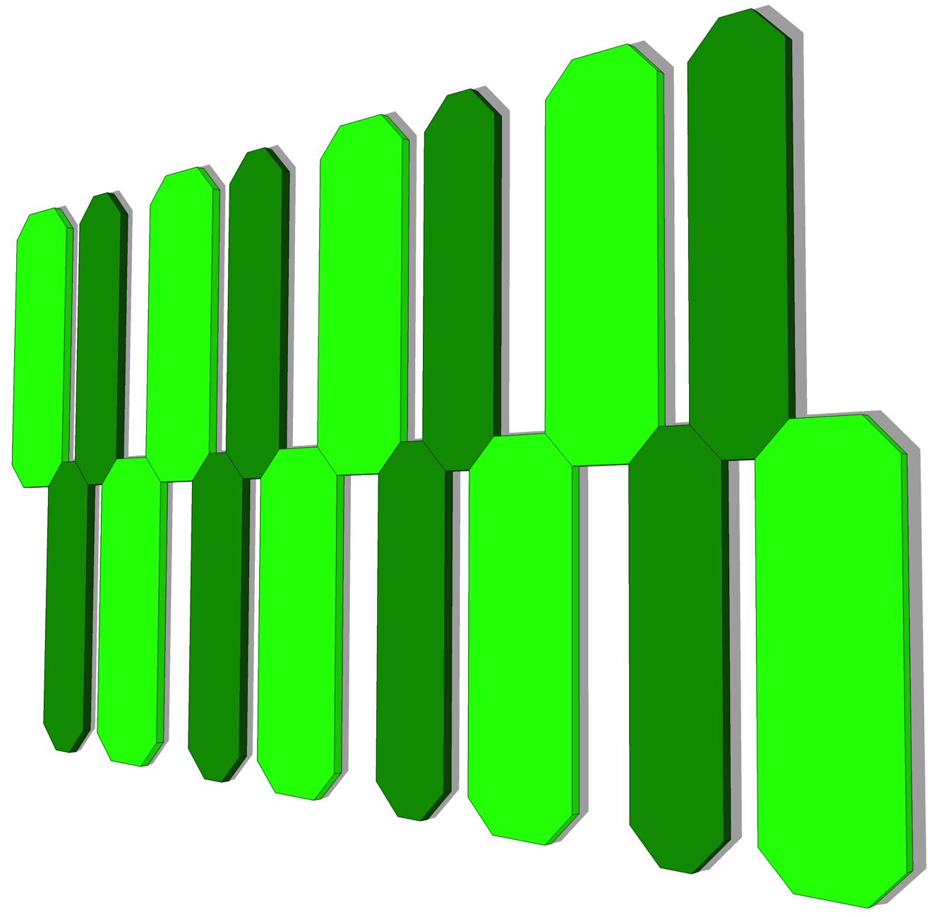 Gli angoli tagliati permettono di affiancare due pannelli tra di loro e creare composizioni in continuità come lame verticali a parete in alternanza cromatica, decorazioni orizzontali, isole a soffitto.