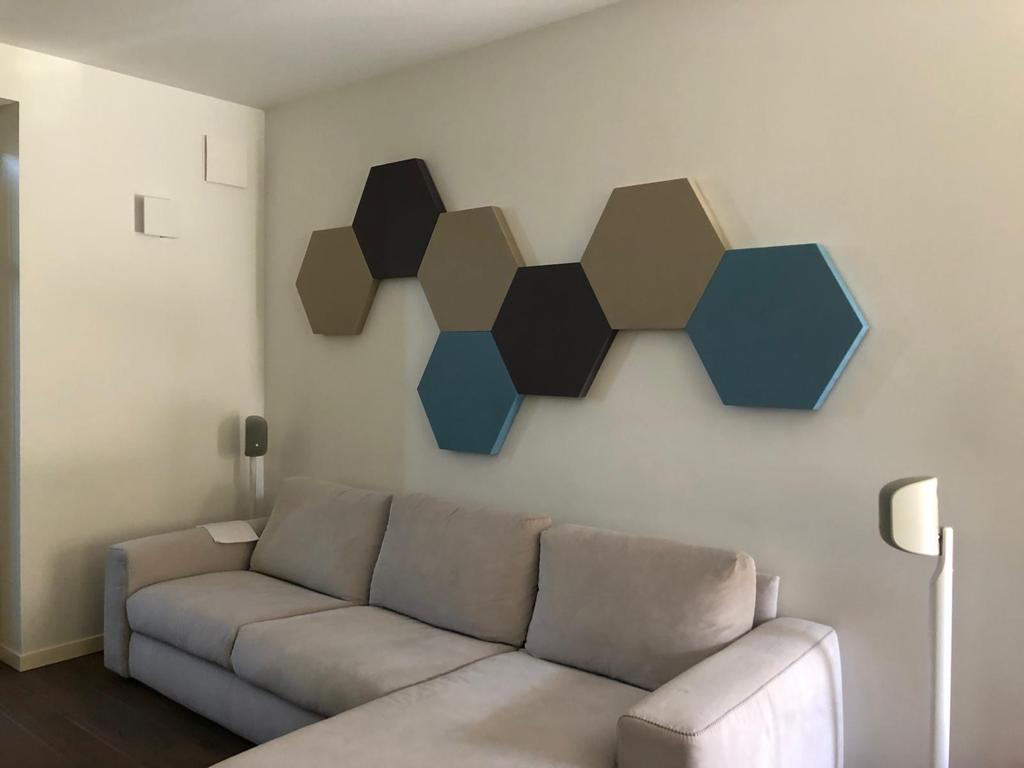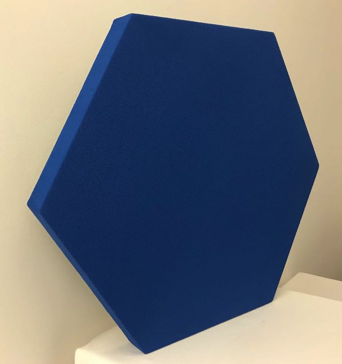 Pannelli fonoassorbenti a parete e soffitto esagonali, rivestiti in tessuto ignifugo senza pieghe o cuciture. Materiale atossico ed ecocompatibile certificato M1. Fino al 60% più efficaci (@500Hz) della fibra di poliestere o della spugna di poliuretano. Prodotto da noi in Italia, anche su misura. Consegna in : 7/15gg lavorativi dall’ordine.