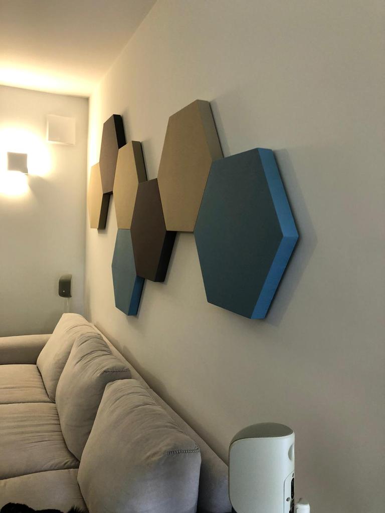 La loro forma permette composizioni a parete e soffitto sfruttando la capacità della geometria esagonale di potersi sviluppare su un piano senza creare spazi vuoti e poter così creare nuove superfici fonoassorbenti articolate e innovative per l’interior design.