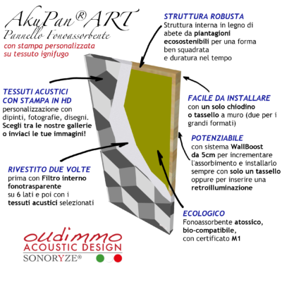 AkuPan® ART è la serie di quadri fonoassorbenti di design ad alte prestazioni personalizzabili online. Sono realizzati da noi in Italia con stampa digitale ad alta risoluzione su tessuto ignifugo fonotrasparente certificato ISO 10534-2 e con materiale fonoassorbente atossico ed ecocompatibile certificato M1.