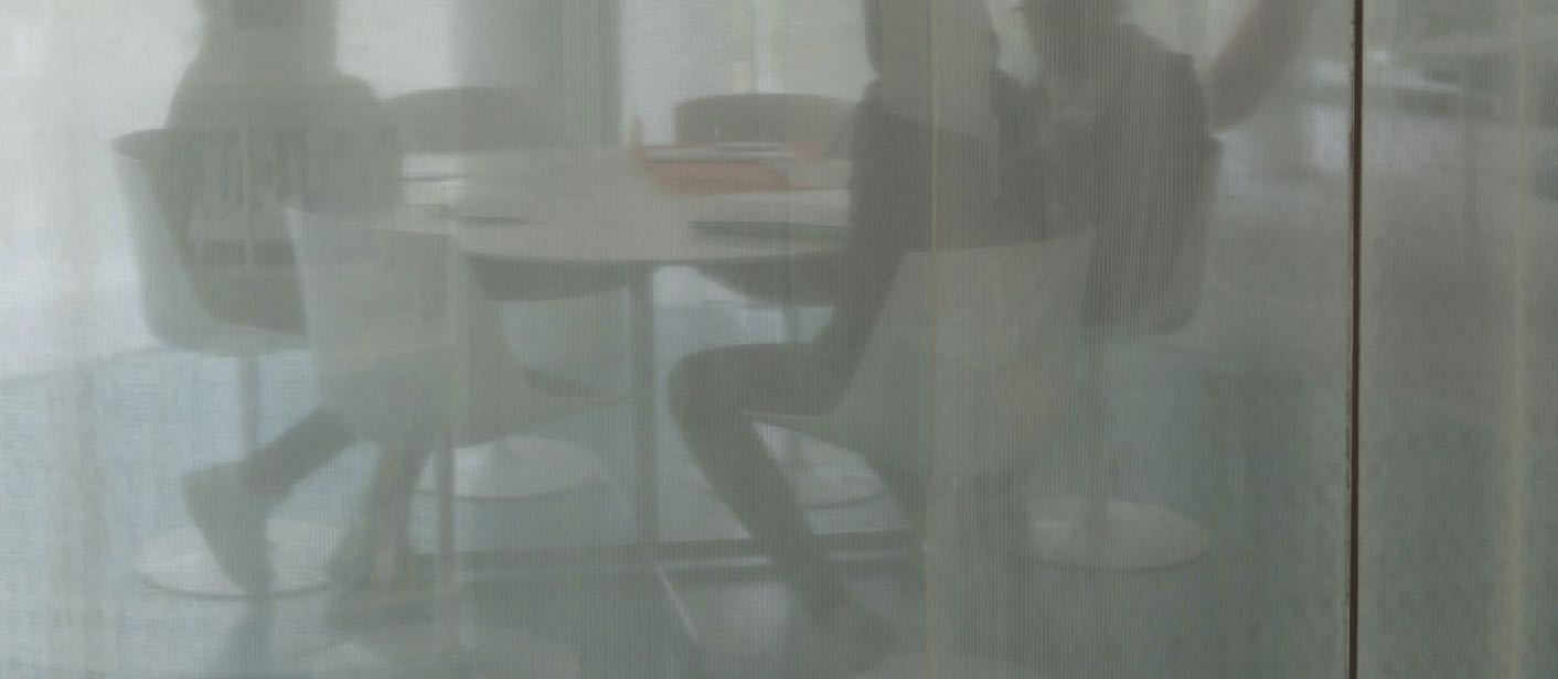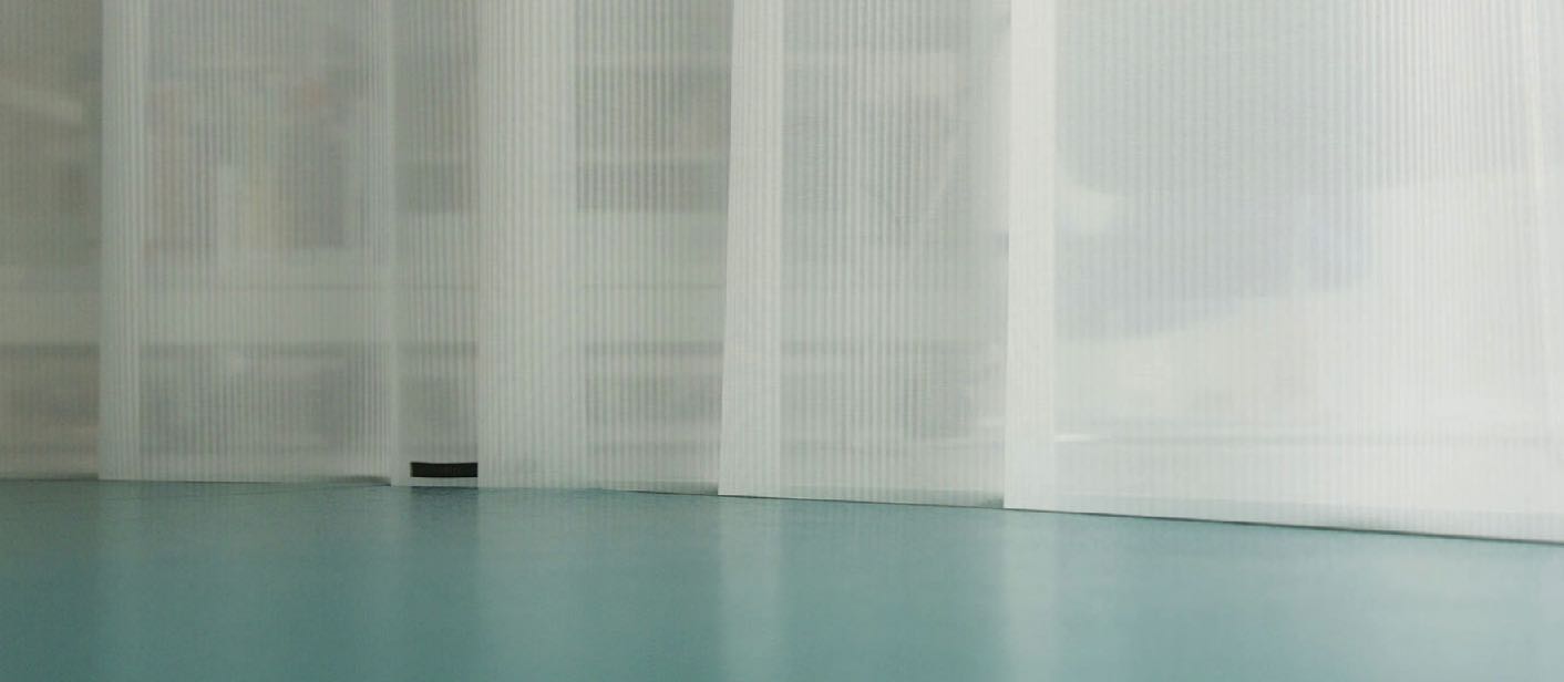 Tessuto per tenda fonoassorbente trasparente alla vista, in modo che possa filtrare la luce e, nello stesso tempo, attenuare il rumore e la riverberazione.